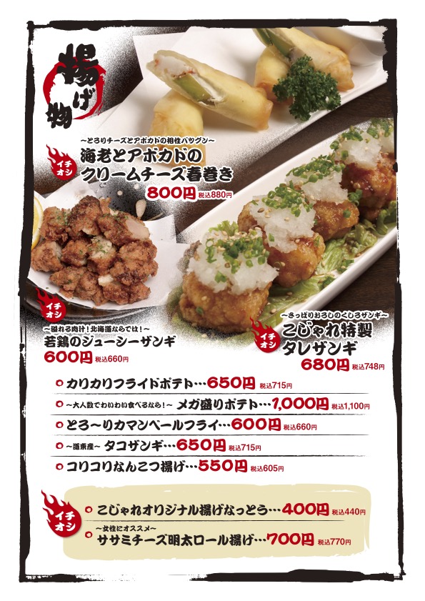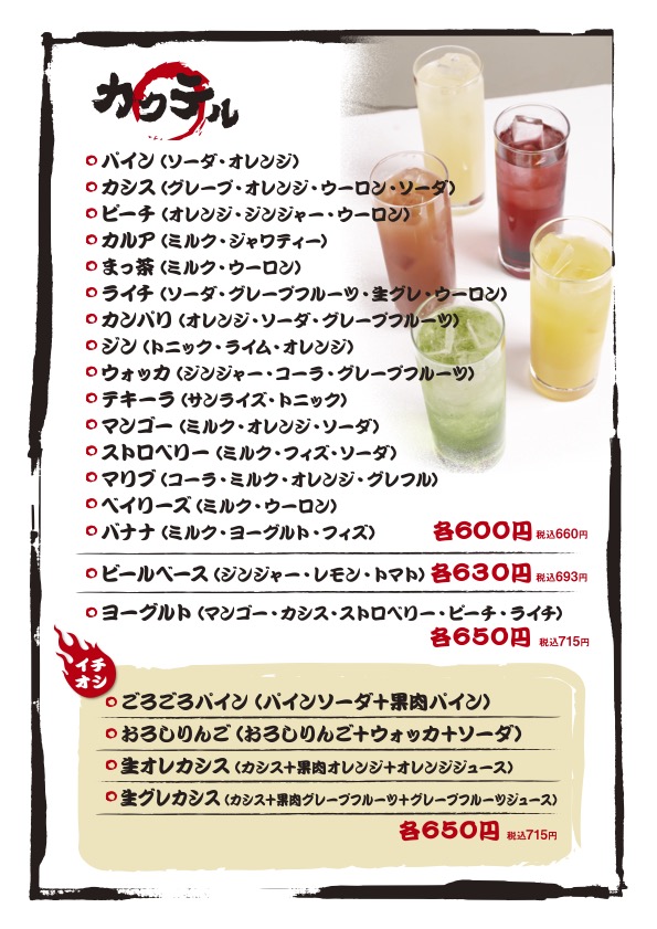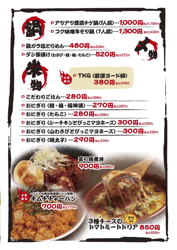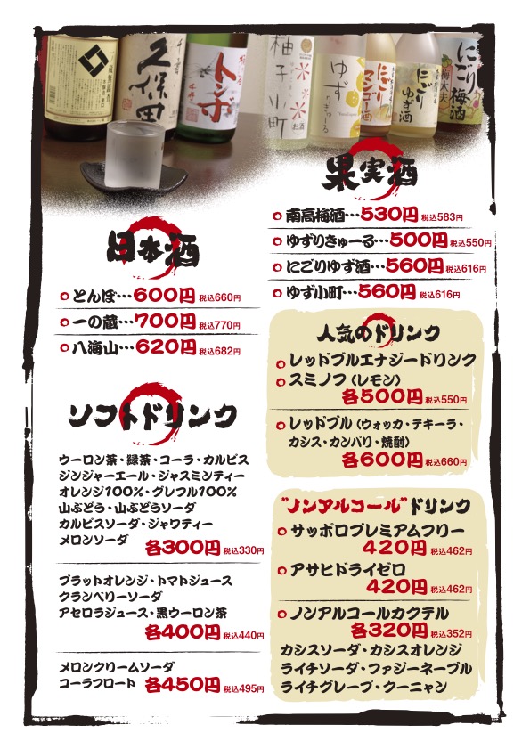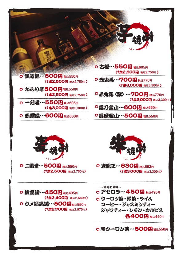 | 営業時間 | 平日 18:00〜23:00 金・土・祝日前 18:00〜24:00 日曜 18:00〜22:00 |